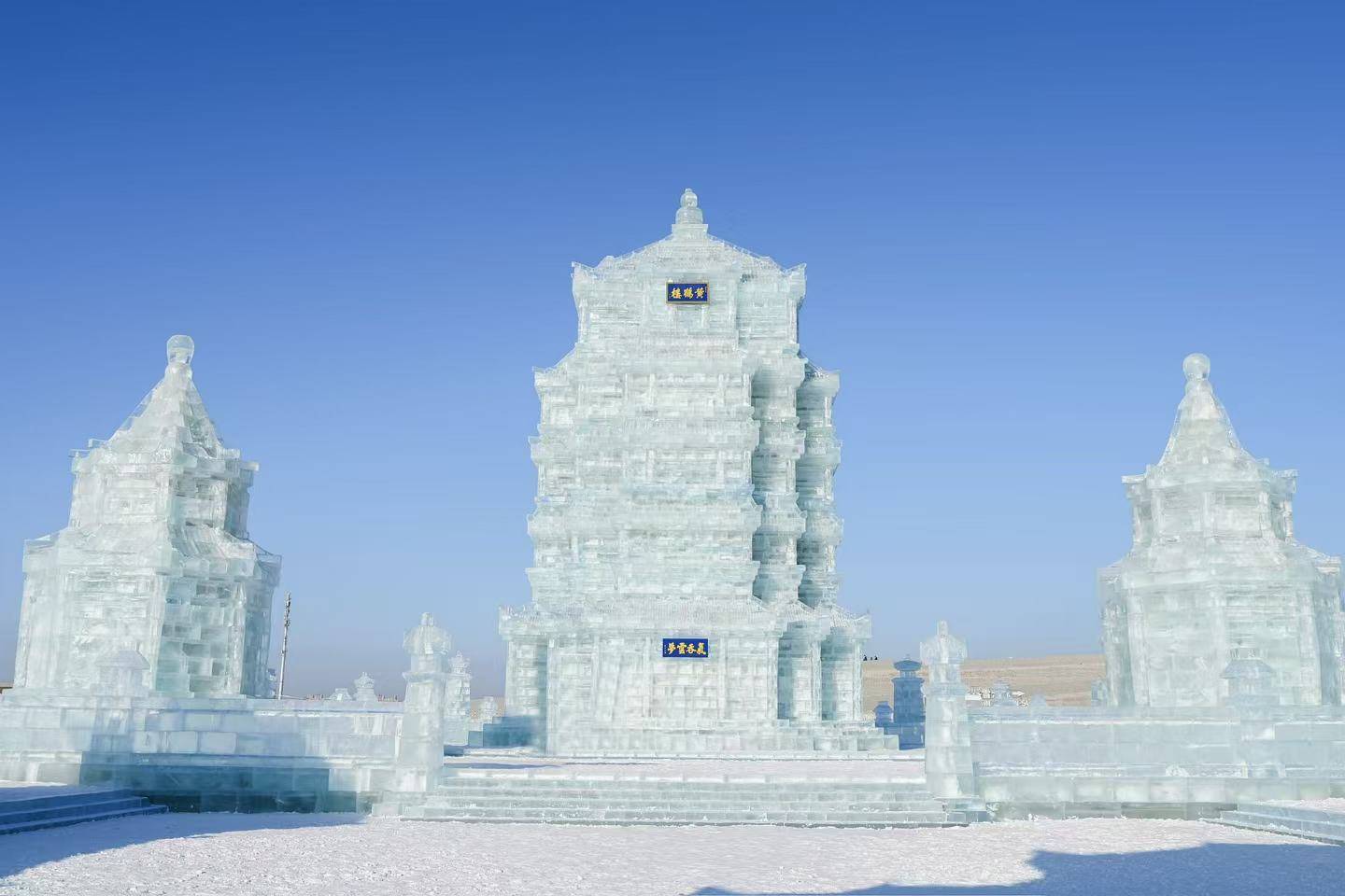 第二十七届哈尔滨冰雪大世界园区内的黄鹤楼冰建。(哈尔滨冰雪大世界供图)在园区内,以武汉黄鹤楼为原型的冰建,充满“鹤影掠空”的东方意境;比利时布鲁塞尔市标“小于廉”冰雕,见证中比两国友好交流。以哈尔滨火车站为蓝本的主形象大门、中华巴洛克风格的冰雪景观群,将这座城市的历史文脉凝结于冰雪之中。